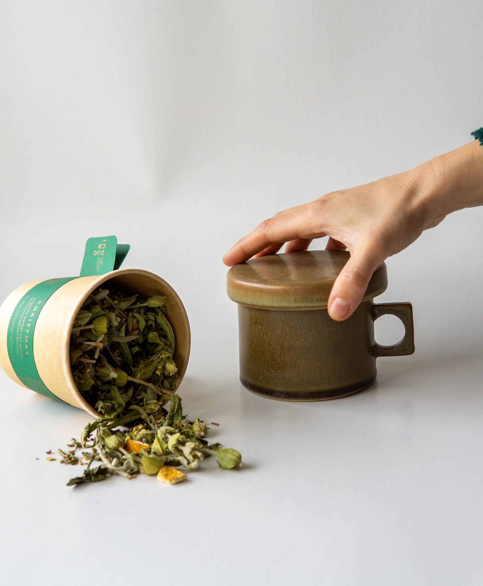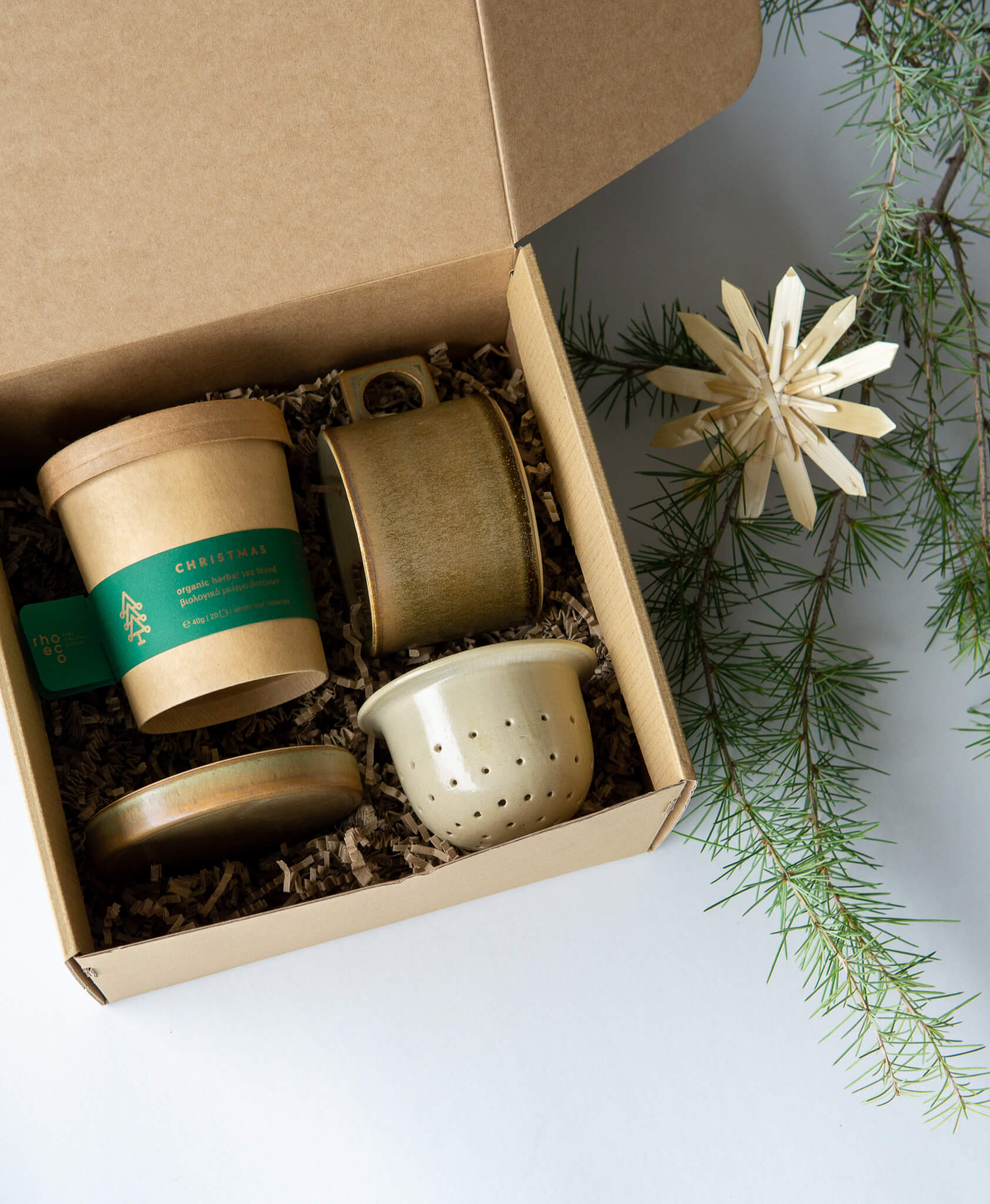 - Ένα κεραμικό σετ που αποτελείται από κούπα, σουρωτήρι, καπάκι/πιάτο, φτιαγμένο στο χέρι αποκλειστικά για την rhoeco, από την Hakah Ceramics.